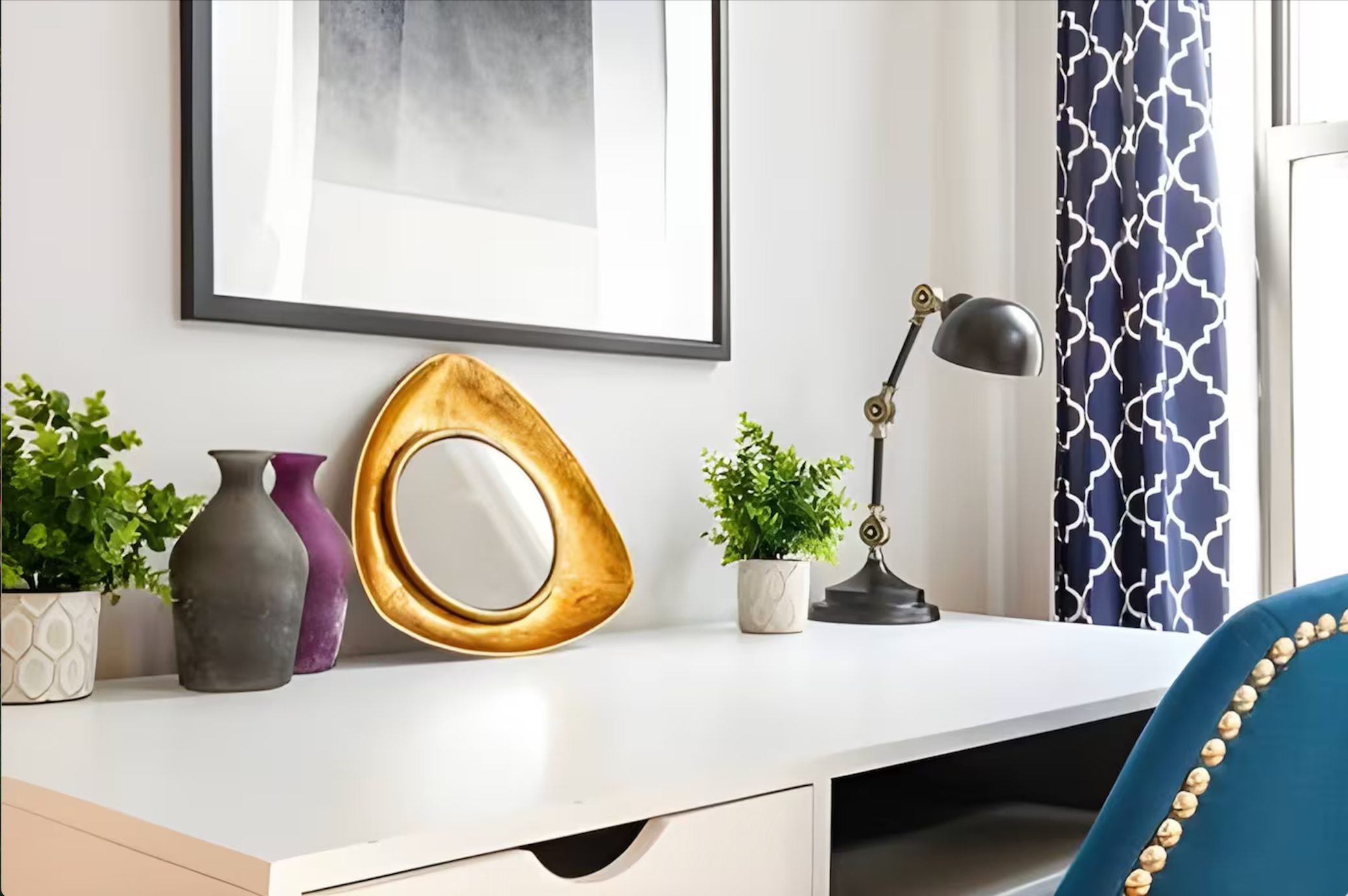 The living room is spacious with lounging chairs and several throw pillows. Enjoy the artwork and the refreshing yet eclectic pops of color. Fitting for a Townhome in NYC.